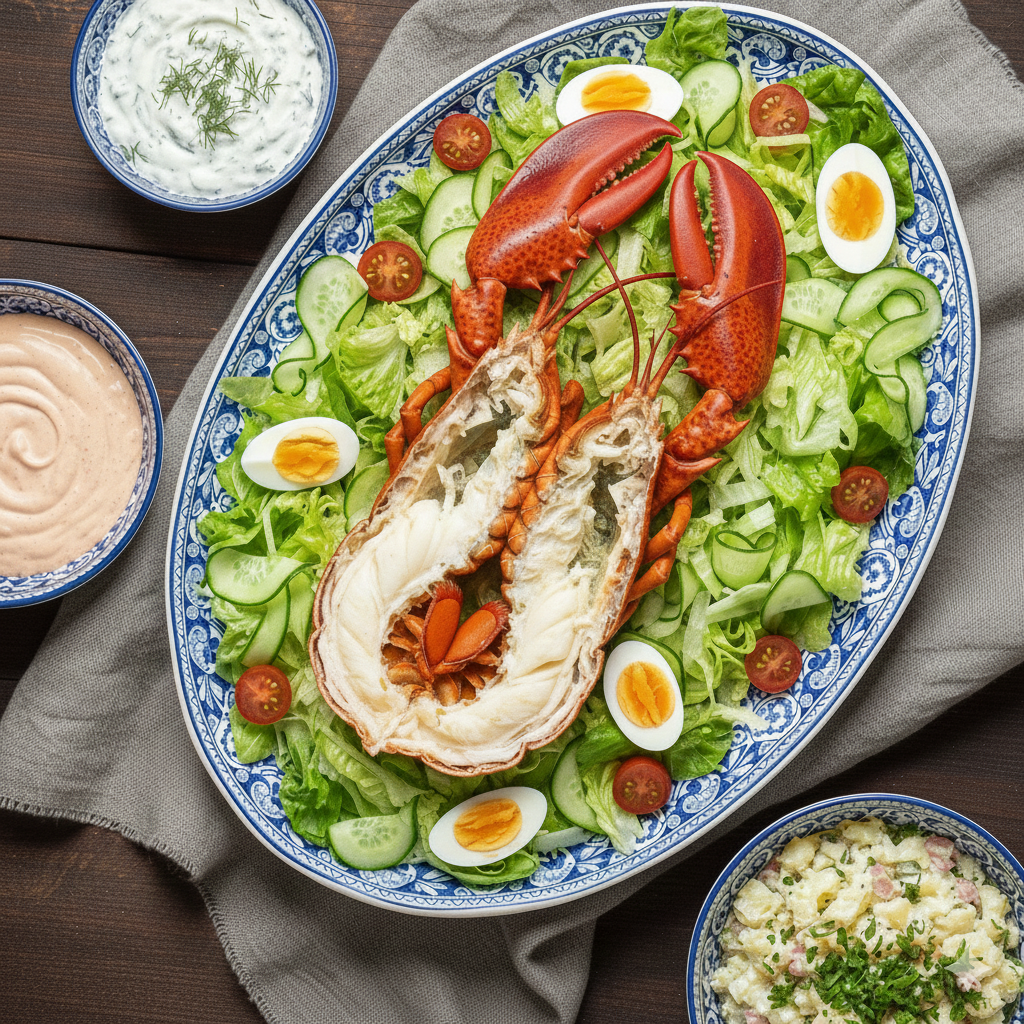 Feestelijke koude kreeftbereiding - frisse groenten - ei - aardappelsla - huisgemaakte tartaar - en cocktailsaus