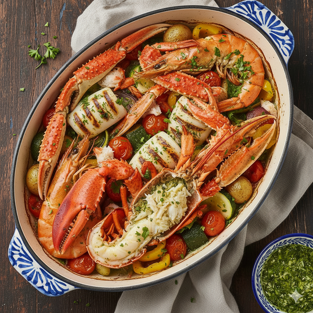Scampi - gamba's - inktvis- krab - langoustines -zuiderse groenten - krieltjes - kruidenboter