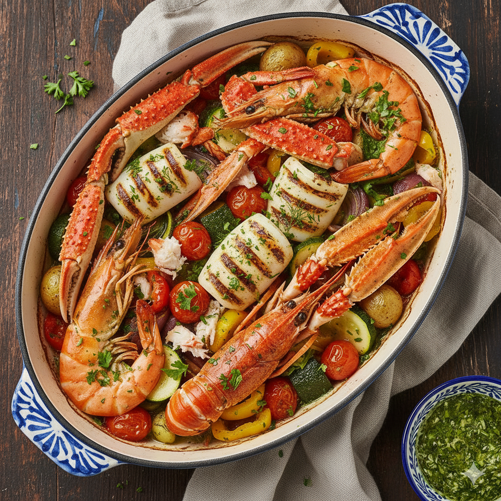Scampi - gamba's - inktvis- krab - langoustines -zuiderse groenten - krieltjes - kruidenboter